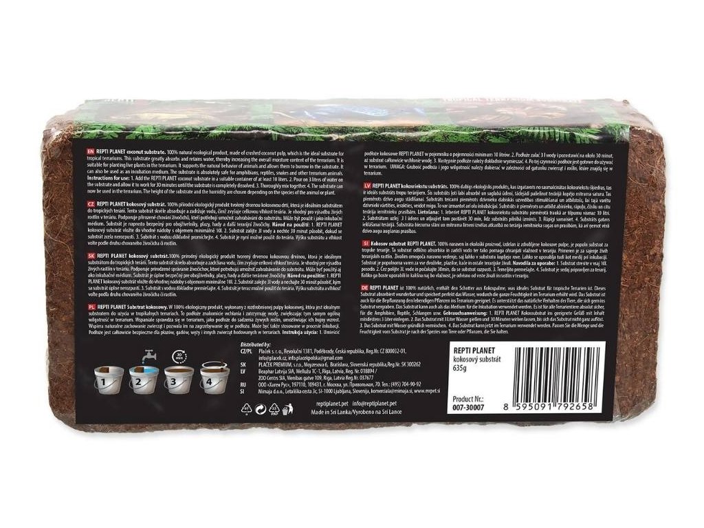 NÁVOD K POUŽITÍ: Vložte do vhodné nádoby s objemem minimálně 10 litrů. Zalijte 3litry vody a nechte 30 minut působit dokud se substrát zcela nerozpustí. Substrát s vodou důkladně promíchejte. Poté můžete použít do terária.