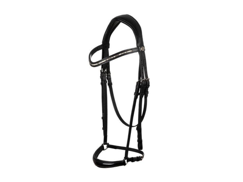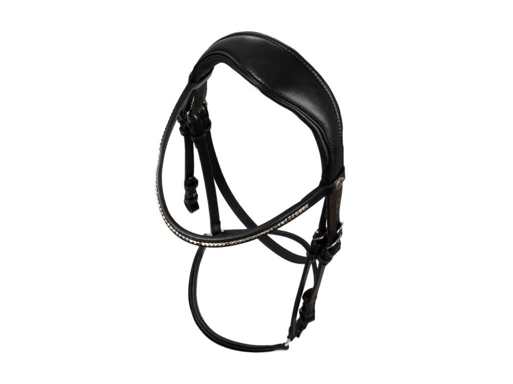 Pružný a anatomický nátylník zmírňuje tlak v oblasti lebky koně a zajišťuje pohodlné a neomezené nošení. Vybavena měkkým hannoverským nánosníkem. Tvarovaná čelenka s diamanty nabízí elegantní design.