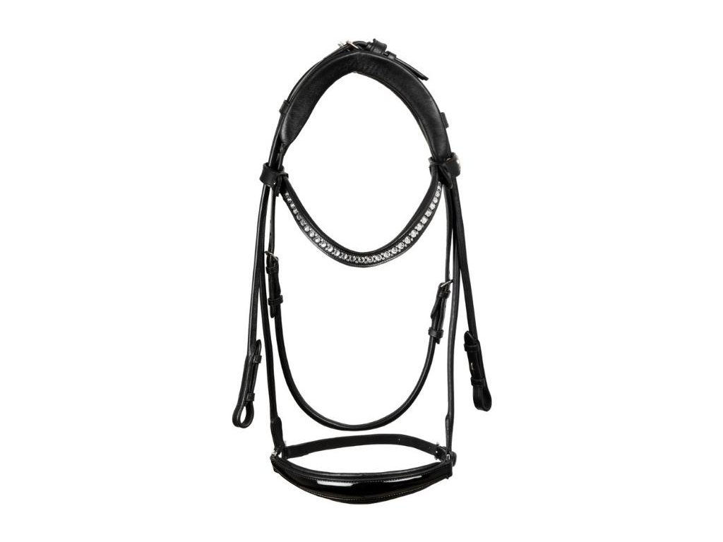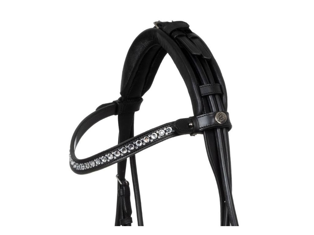 Pružný a anatomický nátylník zmírňuje tlak v oblasti lebky koně a zajišťuje pohodlné a neomezené nošení. Vybavena měkkým hannoverským nánosníkem. Tvarovaná čelenka s kamínky nabízí elegantní design.