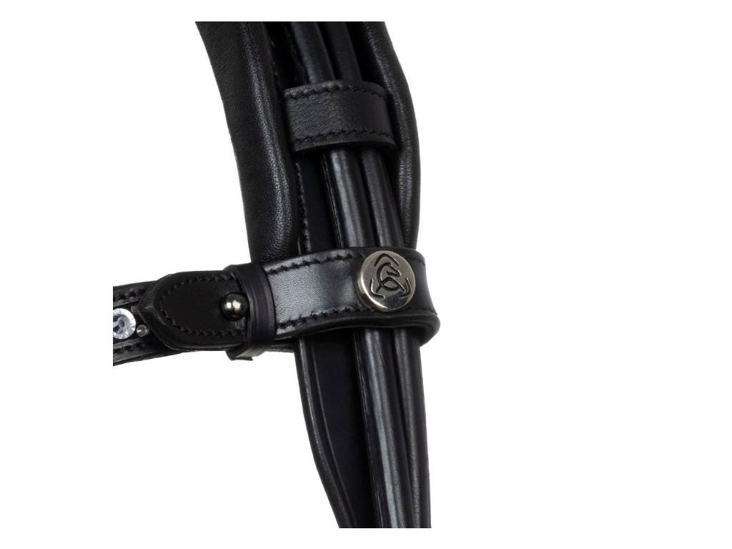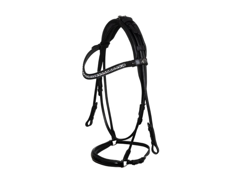 Pružný a anatomický nátylník zmírňuje tlak v oblasti lebky koně a zajišťuje pohodlné a neomezené nošení. Vybavena měkkým hannoverským nánosníkem. Tvarovaná čelenka s kamínky nabízí elegantní design.