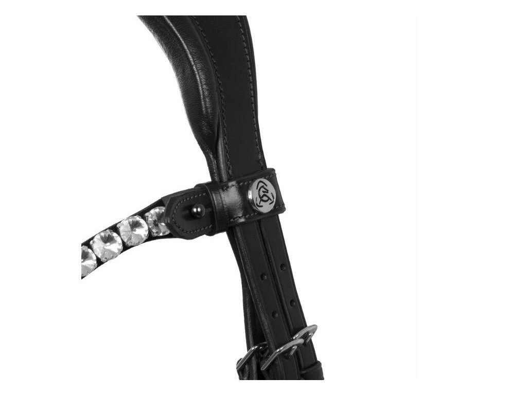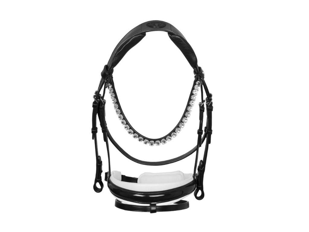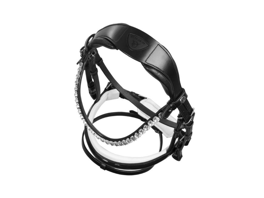 Je vyrobená z nejjemnější italské telecí kůže. Tvarovaný anatomický nátylník je navržen tak, aby snižoval tlak na lebku koně a zajišťoval vynikající pohodlí, aniž by zasahoval do jemných uší koně. Čelenka a nánosník jsou polstrované latexem a mají elegantní bílé lemování, které uzdečce dodává rafinovaný a osobitý design. Robustní přezky z nerezové oceli zajišťují odolnost a bezpečné zapínání. Uzdečka je kombinací stylu, funkčnosti a řemeslného zpracování, která uspokojí i ty nejnáročnější jezdce.