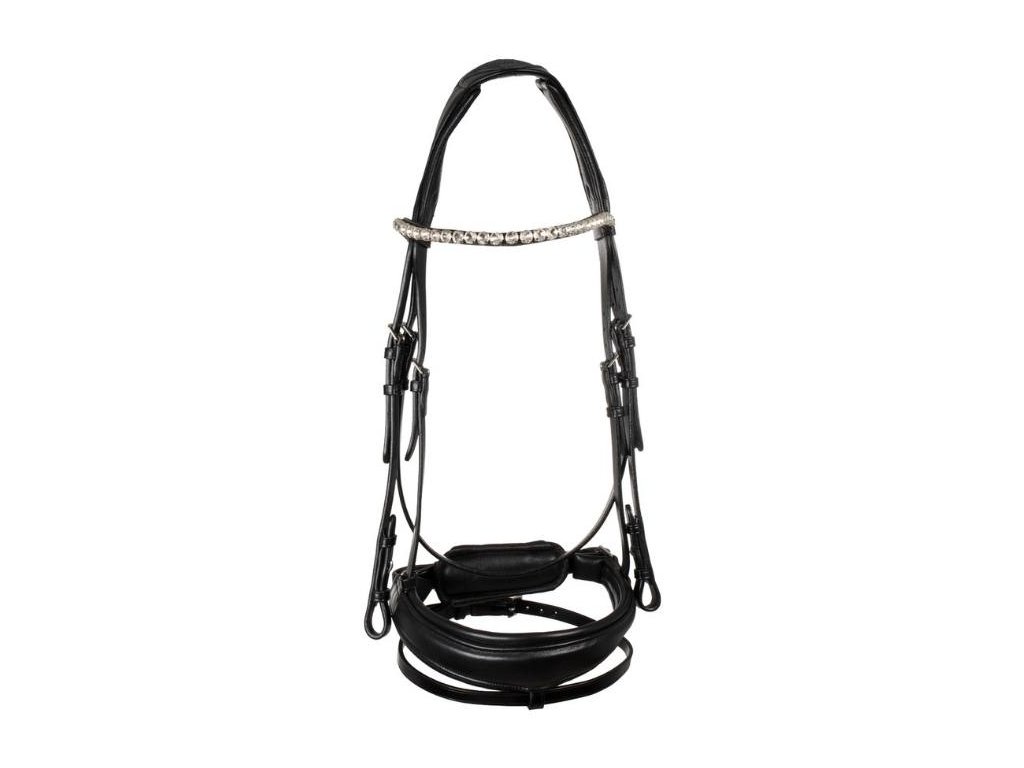 Vysoce kvalitní uzdečka z velmi měkké pravé italské hovězí kůže s švédským nánosníkem. Čelenka pokrytá diamanty je elegantním výrazným prvkem, který uzdečce dodává rafinovaný a třpytivý design