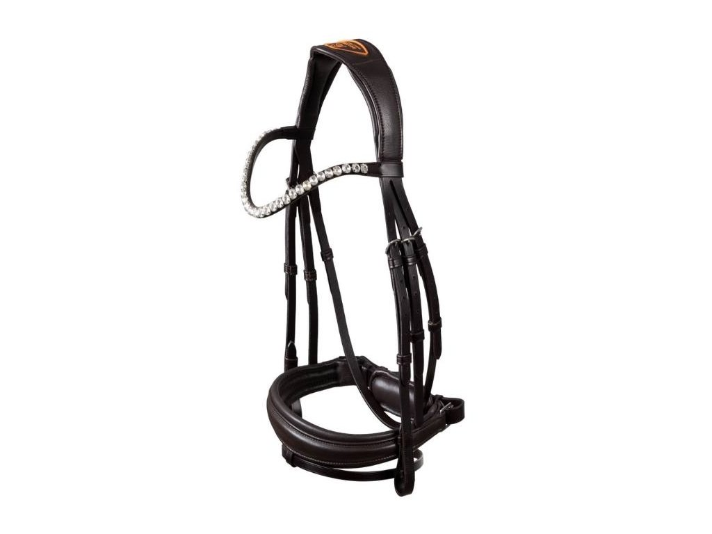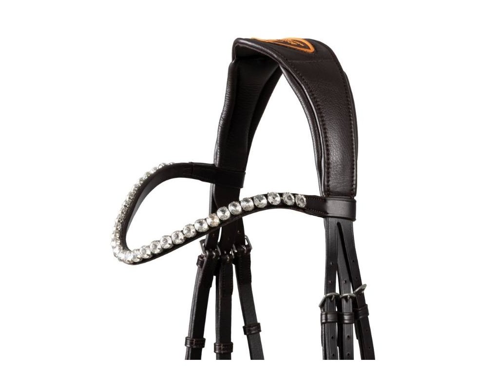 Vysoce kvalitní uzdečka z velmi měkké pravé italské hovězí kůže s švédským nánosníkem. Čelenka pokrytá diamanty je elegantním výrazným prvkem, který uzdečce dodává rafinovaný a třpytivý design