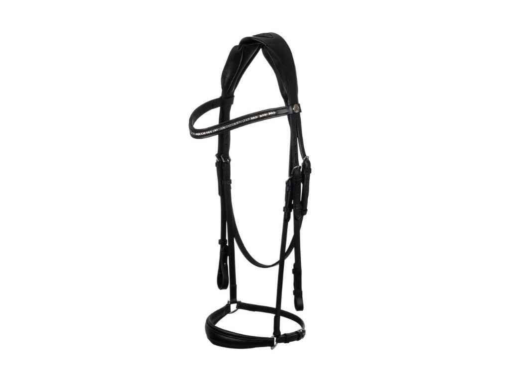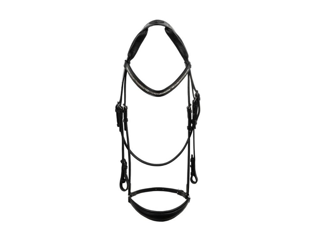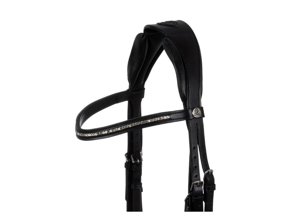 Pružný a anatomický nátylník zmírňuje tlak v oblasti lebky koně a zajišťuje pohodlné a neomezené nošení. Vybavena měkkým hannoverským nánosníkem. Tvarovaná čelenka s kamínky nabízí elegantní design.
