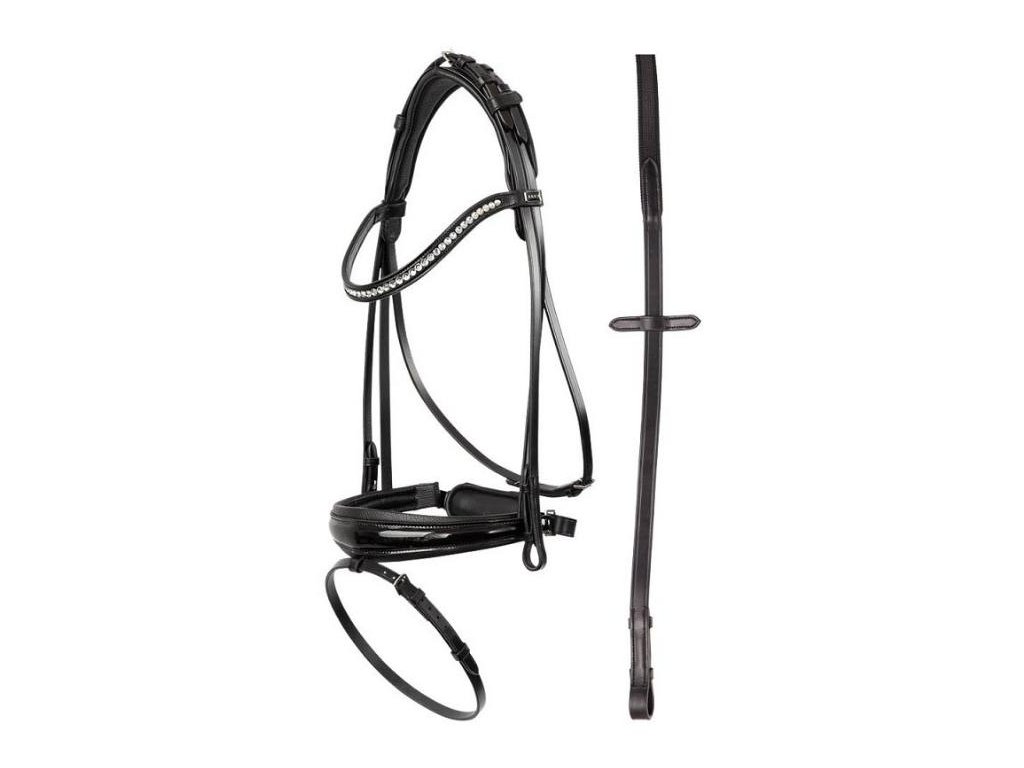 Tato krásná anatomická uzdečka vyniká vysokou úrovní pohodlí a luxusními prvky, jako je lakovaná kůže a lesklé imitace diamantů. Přezky jsou umístěny na horní části nátylníku a lícnice jsou opatřeny háčky.