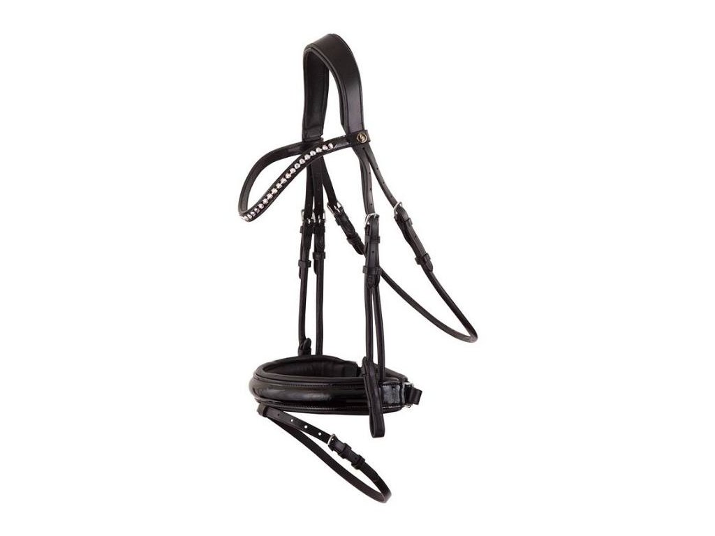 Luxusní uzdečka BR Eston z kulaté lakované kůže. Se Swarovskimi kamínky a oblou čelenkou. Anatomický měkce podložený nátylník a nánosník.