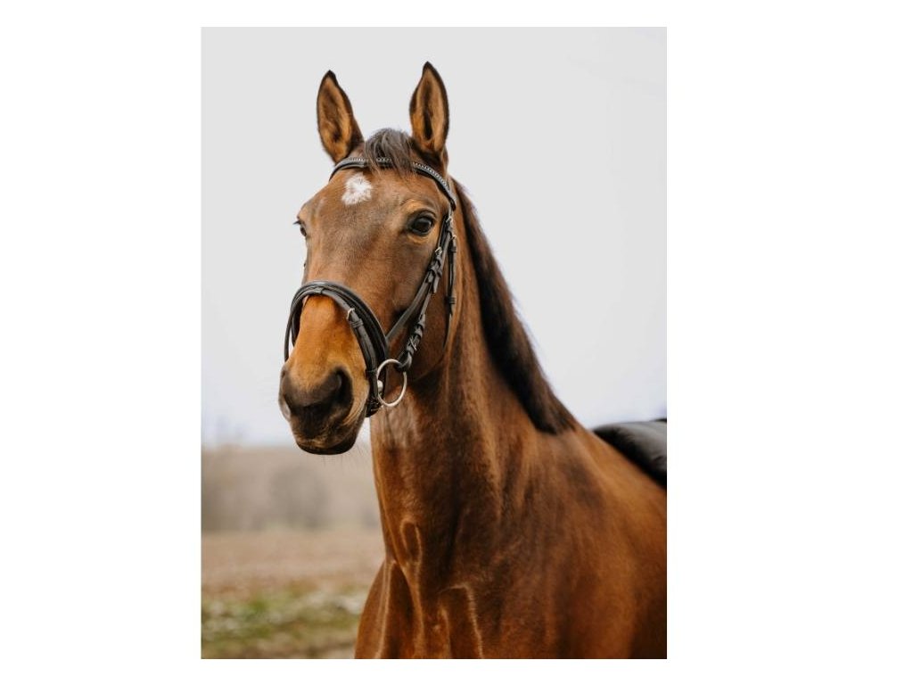 Kvalitní kožená uzdečka pro koně s ozdobnou čelenkou ve tvaru V a měkkým polstrováním.