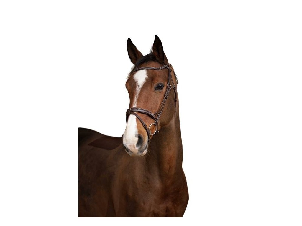 Kvalitní kožená uzdečka pro koně s anglickým nánosníkem a ozdobnou tvarovanou čelenkou.