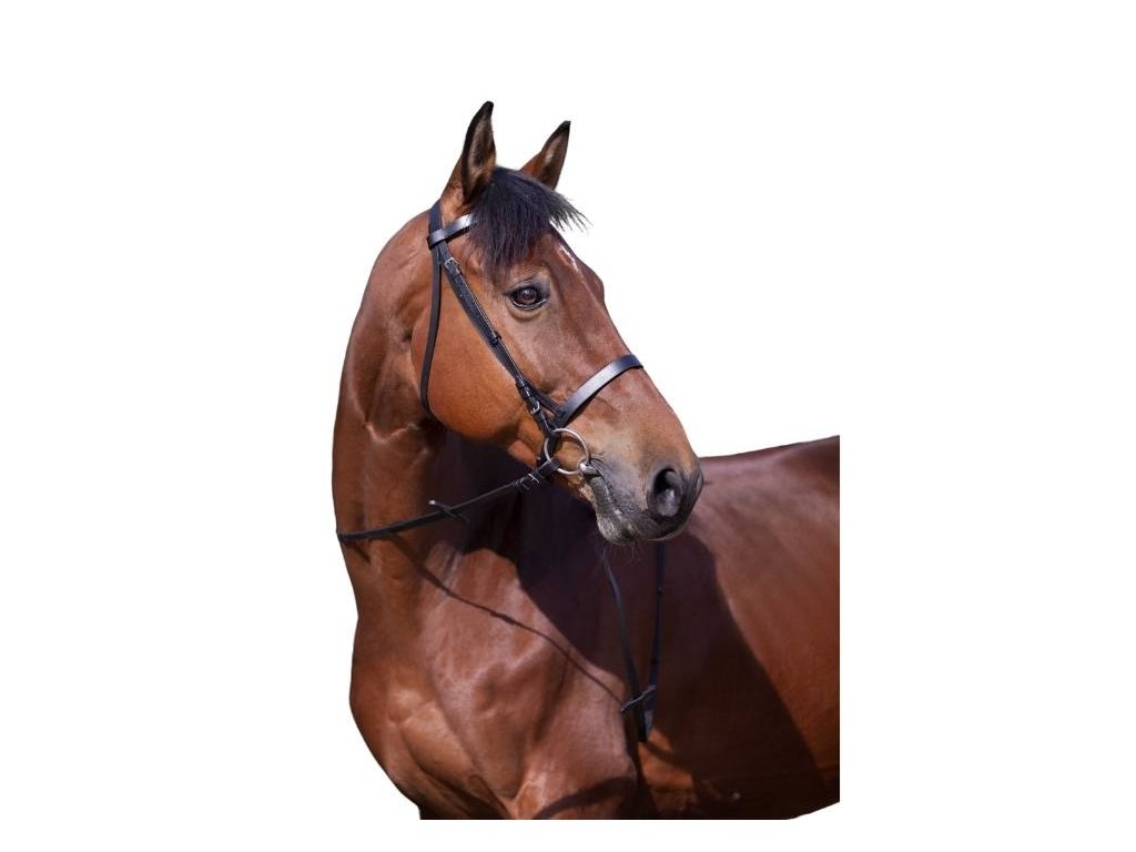 Uzdečka z buvolí kůže s anglickým nánosníkem. Uzdečka má jednoduchou čelenku a plochý nánosník.