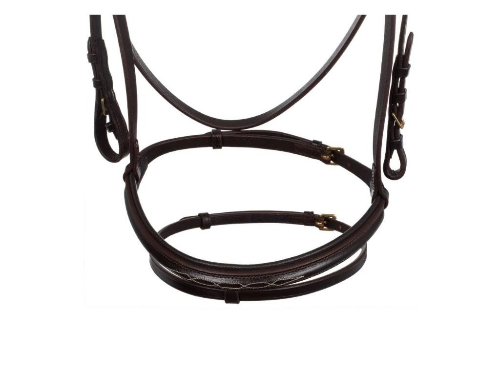 Čelenka a nánosník jsou zdobeny kontrastním prošíváním. Vybavena nerezovými přezkami.