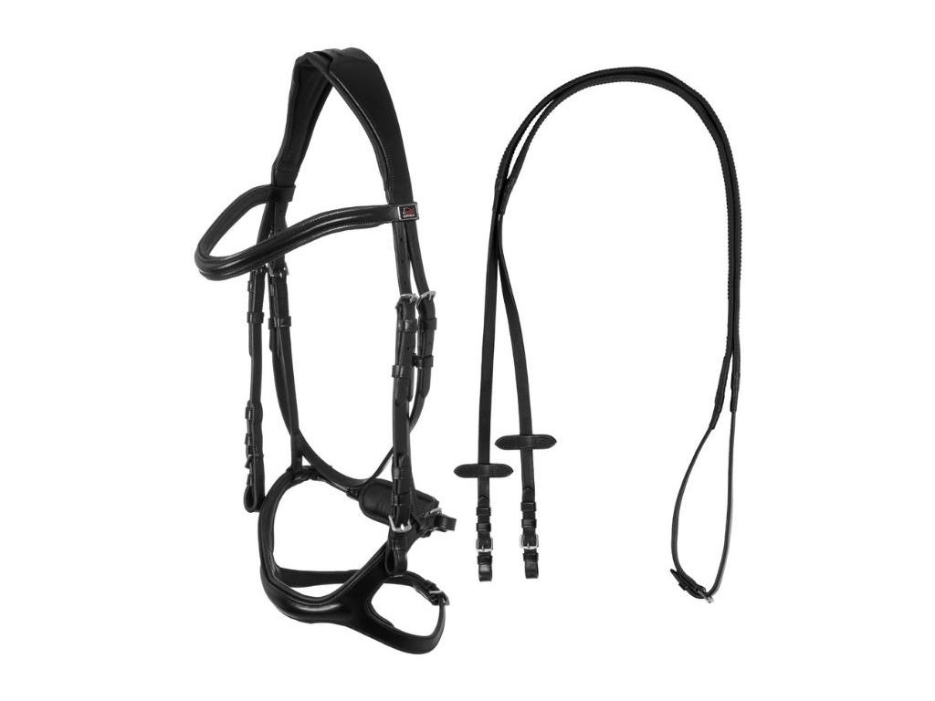 Je měkce polstrovaná pro maximální pohodlí koně. Dodávána včetně otěží.