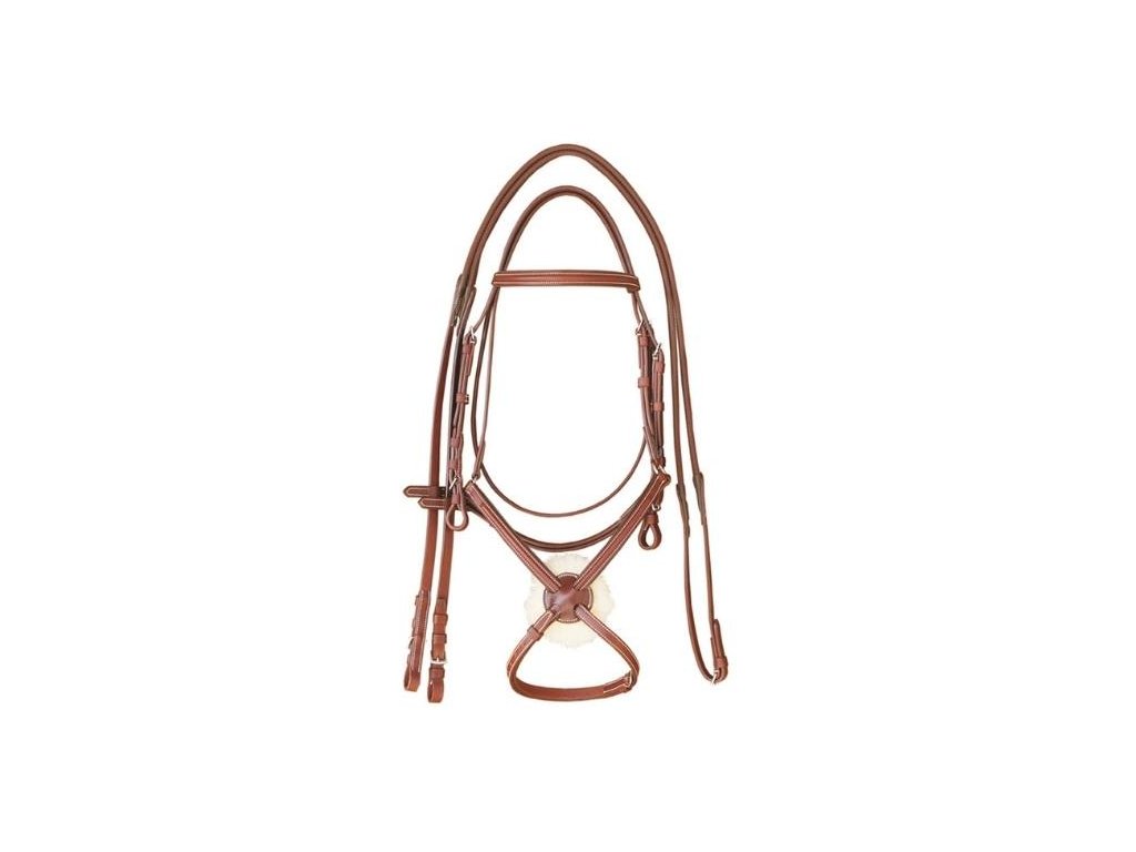Kožená uzdečka zdobená bílým prošíváním, dodávána s gumovými otěžemi.