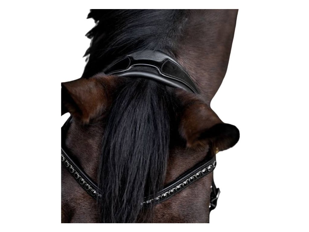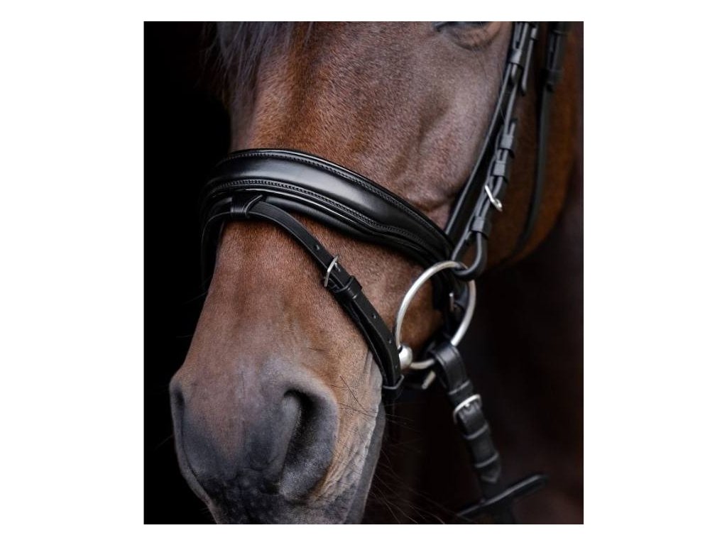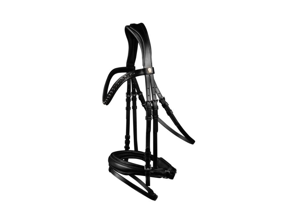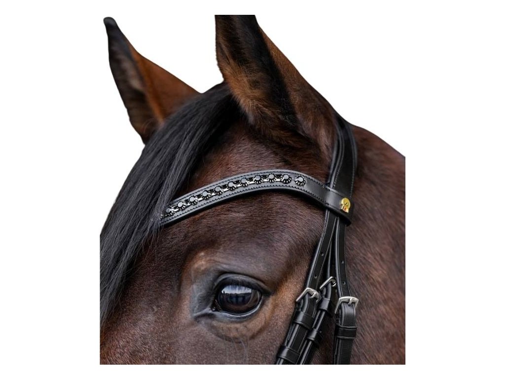 Vysoce kvalitní kožená uzdečka se švédským kombinovaným nánosníkem a měkkým polstrováním. Uzdečka má široký anatomicky tvarovaný nátylník a čelenku ve tvaru V. Čelenka je zdobena decentními kamínky v černé barvě.