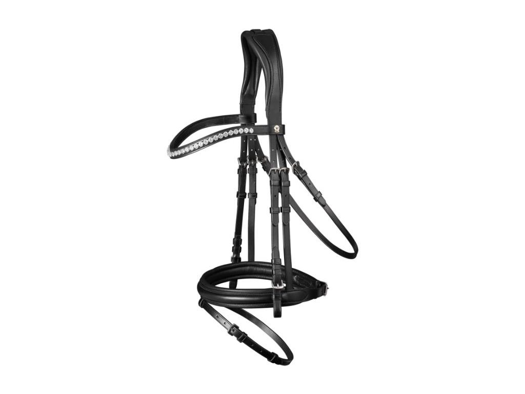 Vysoce kvalitní uzdečka S-line se zajímavým elegantním střihem. Má anglický kombinovaný nánosník a nátylník zajišťující dostatečnou volnost uší, který má extra měkké polstrování. Uzdečka je zdobena zakřivenou čelenkou s měkkým polstrováním se stříbrnými kamínky uprostřed.