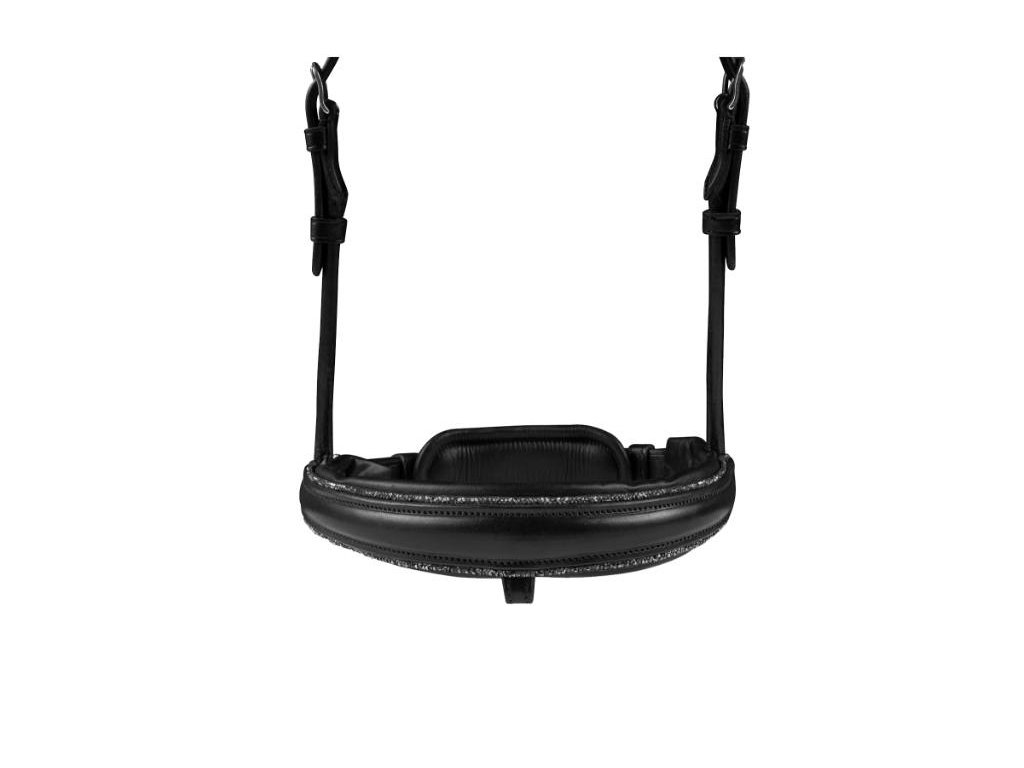 Nátylník poskytuje dostatečnou volnost uší a má extra měkké polstrování. Uzdečka je zdobena zakřivenou čelenkou s měkkým polstrováním a s decentními stříbrnými kamínky uprostřed. Lícnicové a nánosníkové řemínky jsou vyrobené z kulaté kůže.
