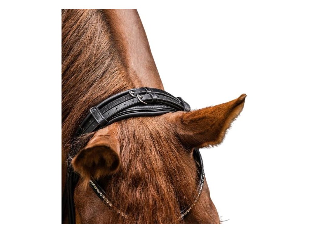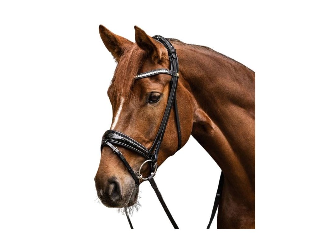Tato uzdečka je opatřena elegantně zdobenou čelenkou a nánosníkem v designu lesklé krokodýlí kůže. Nánosník i lícnice jsou ploché, aby hezky sedly na hlavu koně a co nejméně překážely. Lícnice mají skryté zapínání z vnitřní strany na háčky a velikost se nastavuje na nátylku hlavy. Nátylník i nánosník jsou měkce polstrován.