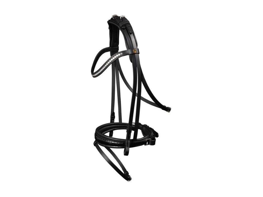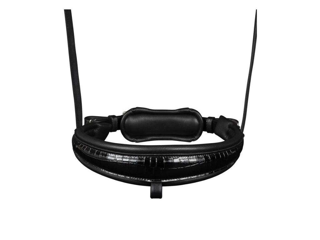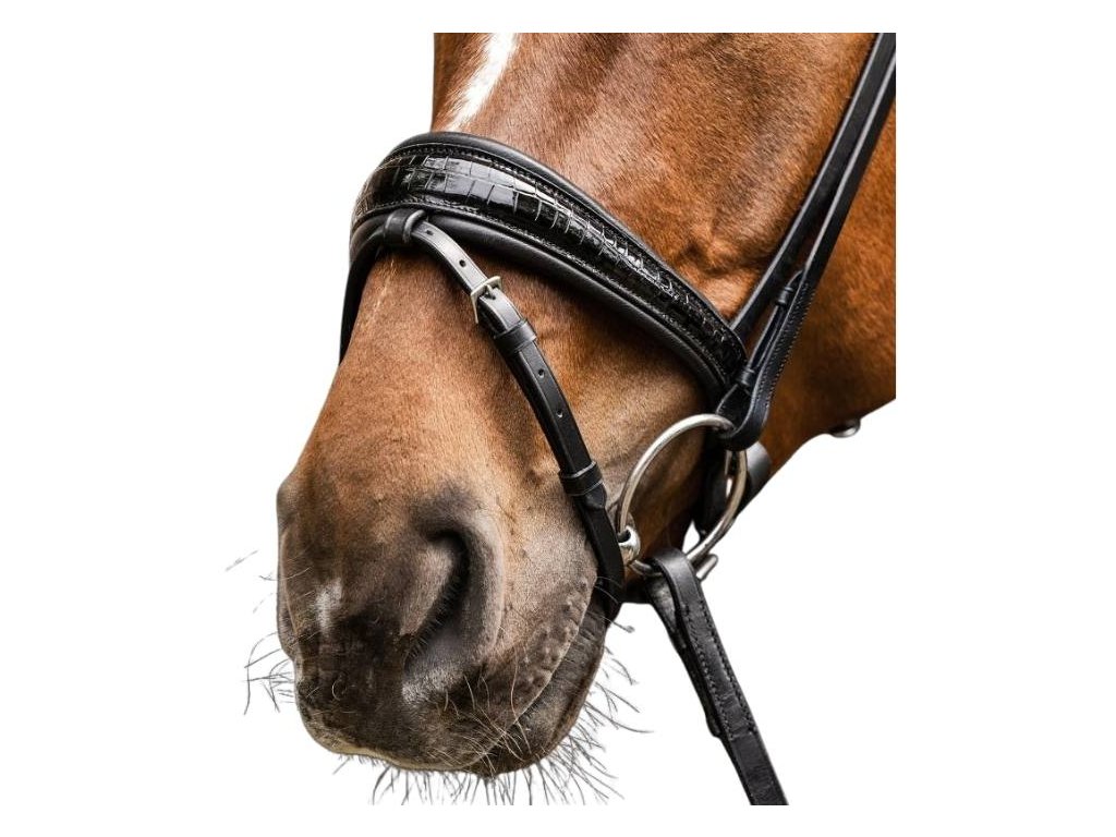 Tato uzdečka je opatřena elegantně zdobenou čelenkou a nánosníkem v designu lesklé krokodýlí kůže. Nánosník i lícnice jsou ploché, aby hezky sedly na hlavu koně a co nejméně překážely. Lícnice mají skryté zapínání z vnitřní strany na háčky a velikost se nastavuje na nátylku hlavy. Nátylník i nánosník jsou měkce polstrován.