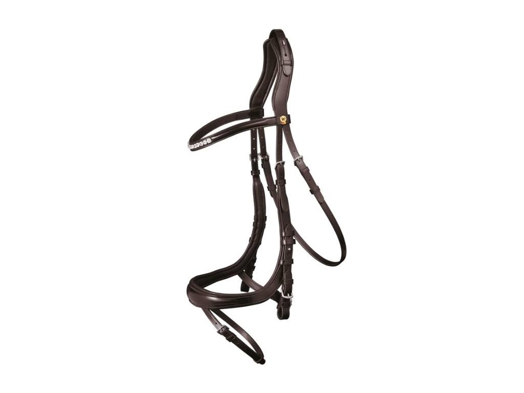 Vysoce kvalitní uzdečka S-line Sensation se zajímavým elegantním střihem. Má anglický kombinovaný nánosník a anatomicky tvarovaný nátylník zajišťující dostatečnou volnost uší. Nánosník s řeminkem je navržen tak, aby zabránil tlaku na nos a tím podpořil volnější dýchání. Podpínací řemínek je odnímatelný. Uzdečka je zdobena zakřivenou čelenkou se stříbrnými kamínky uprostřed