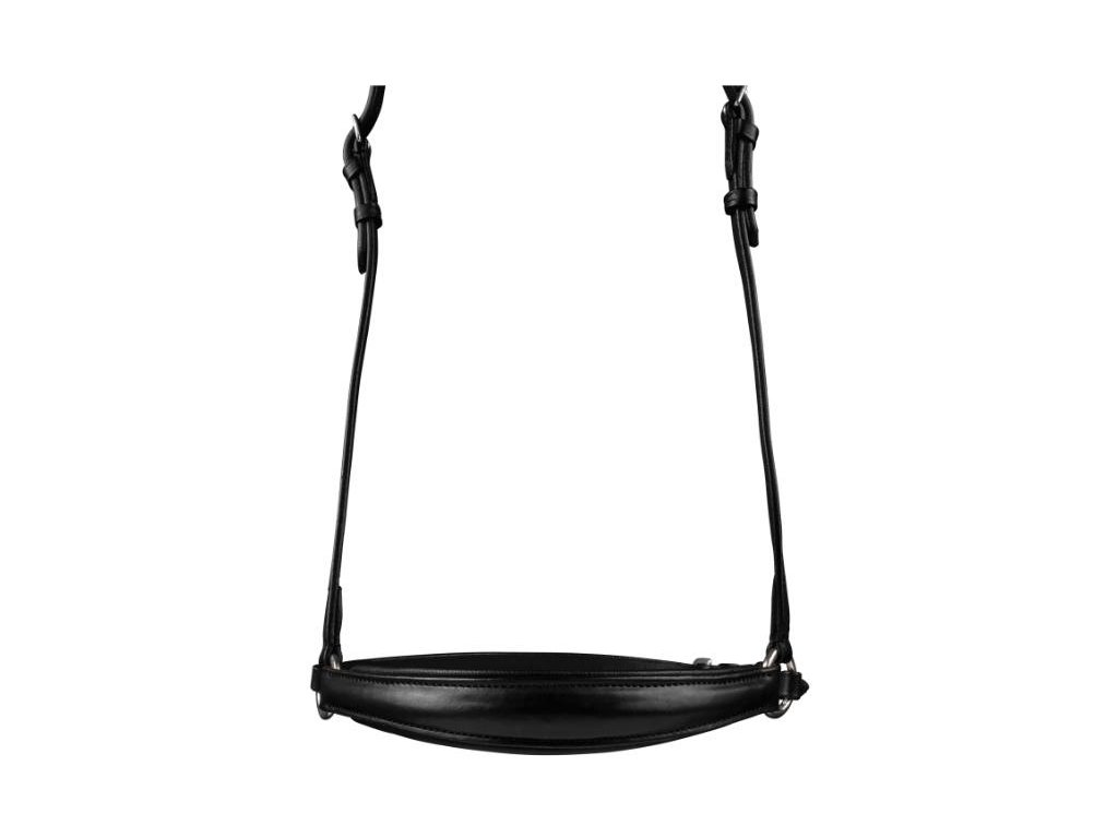 Velmi kvalitní kožená uzdečka s hannoverským nánosníkem. Má zakřivenou čelenku v jednoduchém provedení a anatomicky tvarovaný nátýlník. Čelenka, nánosník i nátylník mají extra měkké polstrování. Uzdečka má kvalitní kování z nerezové oceli