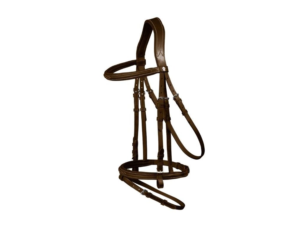 Vysoce kvalitní uzdečka s anglickým kombinovaným nánosníkem a anatomicky tvarovaným nátylníkem. Měkké polstrování čelenky a nátylníku.