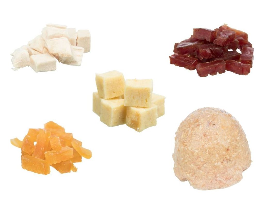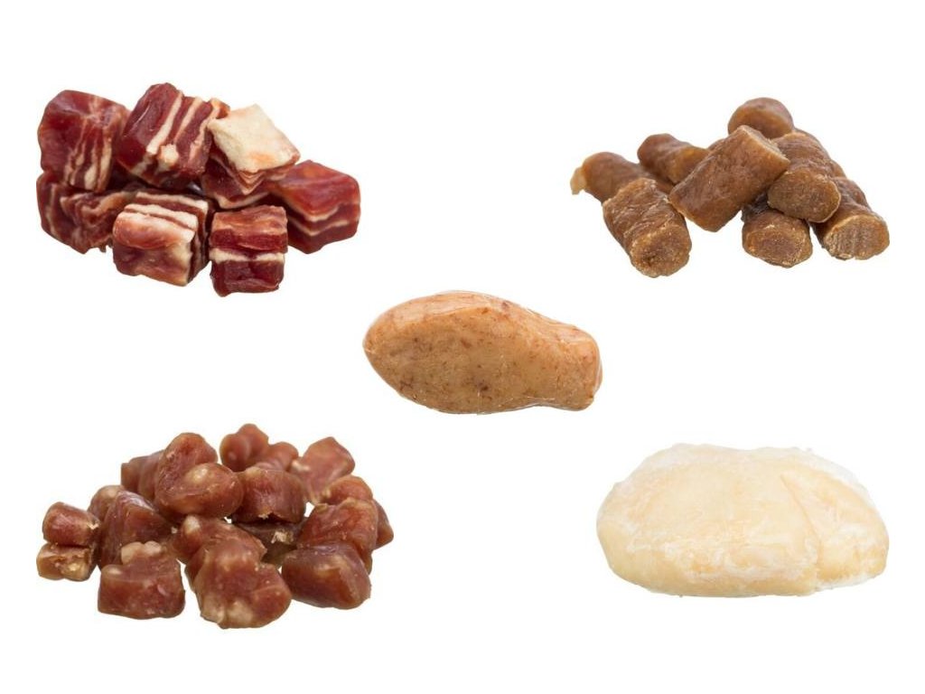 OBSAHUJE: kuřecí - vařené a lyofilizované kousky; ryby s kuřecím - tyčinky, mini srdíčka a proužky; ryba s hovězím - kostky; ryba s kachnou - proužky; rybí kostky a lososový koláček