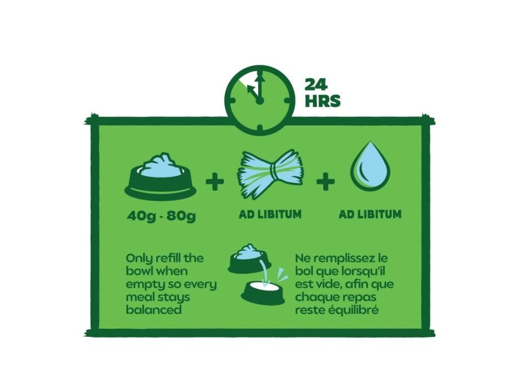 KRMNÝ NÁVOD: V závislosti na velikosti vašeho králíka byste měli podávat 40 až 80 g krmiva denně. Vždy zajistěte seno. Není určeno pro zvířata určená k produkci potravin.