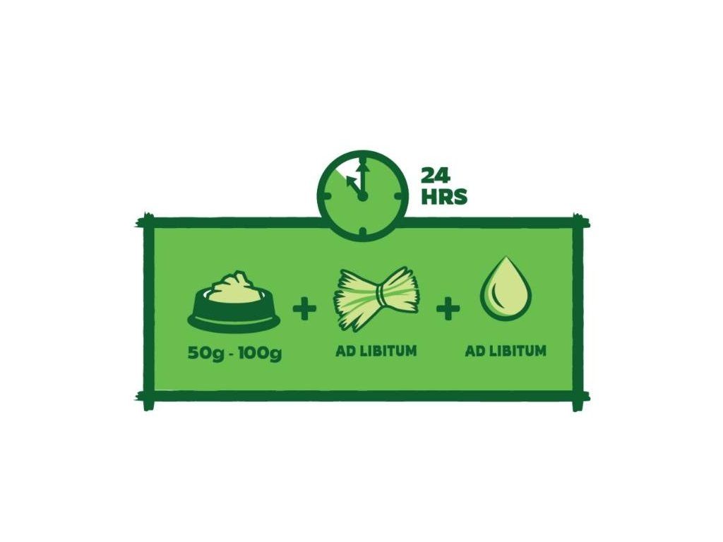 KRMNÝ NÁVOD: V závislosti na velikosti vašeho králíka byste měli podávat 50 až 80 g krmiva denně. Vždy mu zajistěte seno. Není určeno pro zvířata určená k produkci potravin.