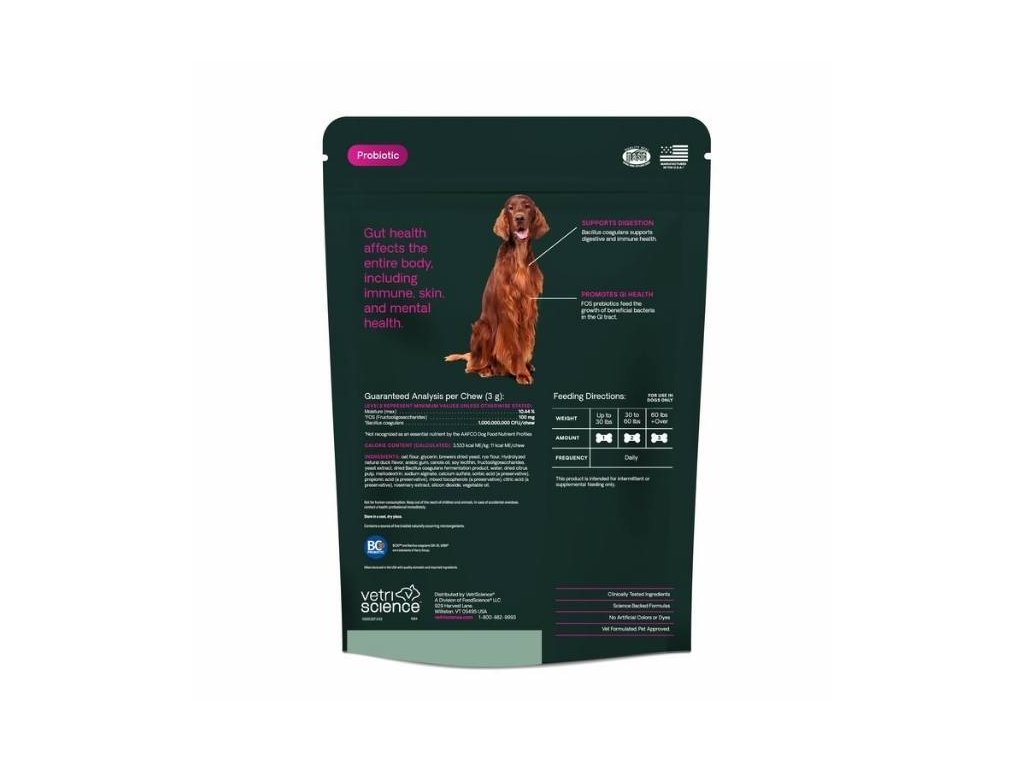 SLOŽENÍ: Bacillus coagulans, FOS (fruktooligosacharidy), ovesná mouka, glycerin, sušené pivovarské kvasnice, žitná mouka, přírodní kachní aroma, řepkový olej, sojový lecitin, fruktooligosacharidy, extrakt z kvasnic, sušené odstředěné mléko, sušený Bacillis coagulans fermentovaný produkt, citrusový pektin, maltodextrin, síran vápenatý