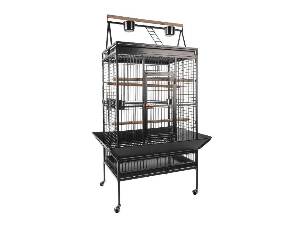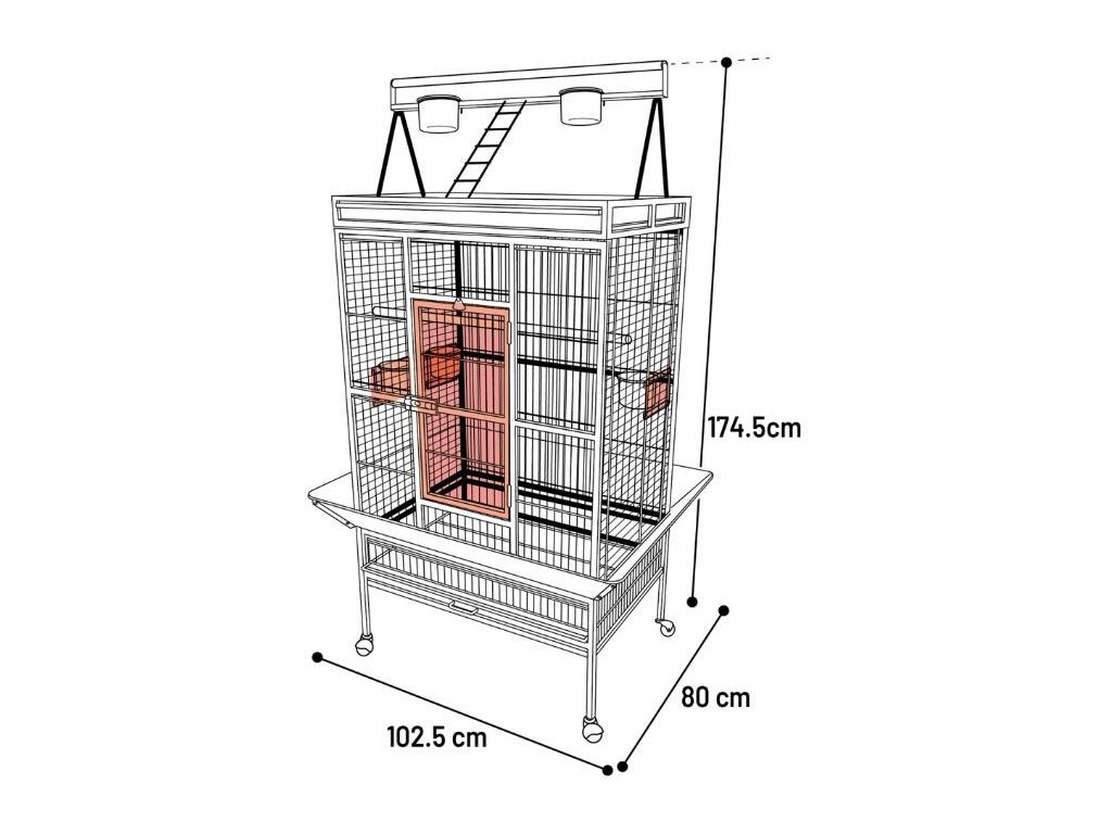 - 1 x velké dveře s bezpečnostním zámkem vpředu, 3 dveře s držákem na misku s jídlem/pitím po stranách, bidýlko a žebřík na střeše