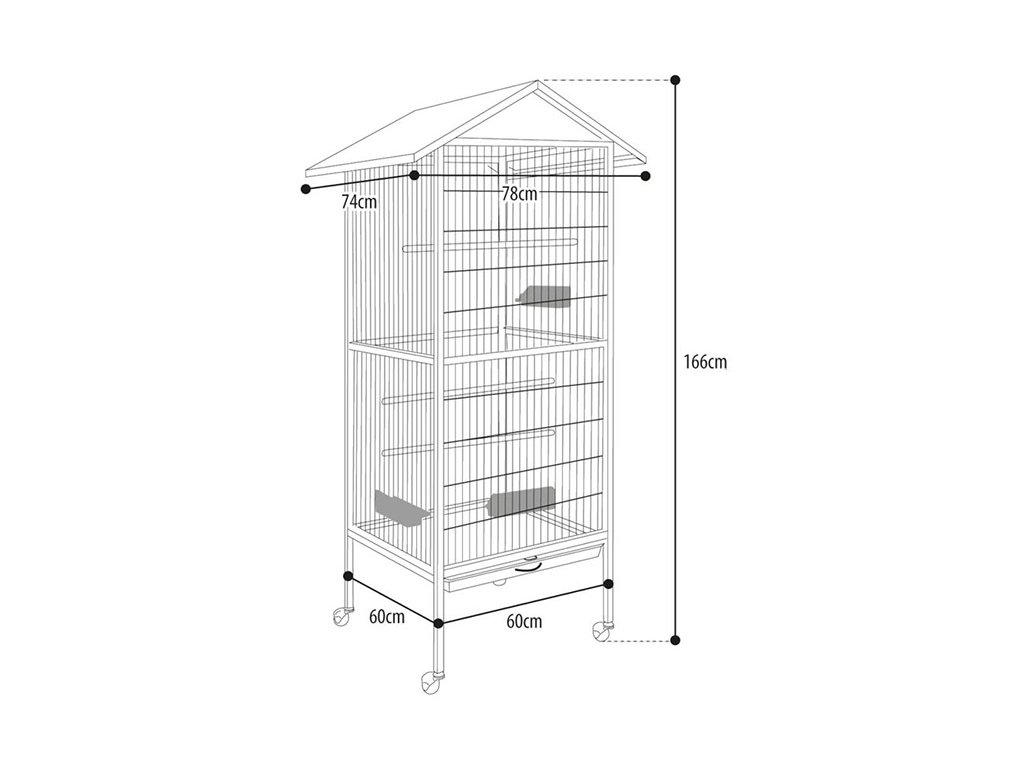 ROZMĚRY: voliéra 78 x 74 x 166 cm; bidýlka 1,8 x 60,5 cm; rozteč mříží 1 cm