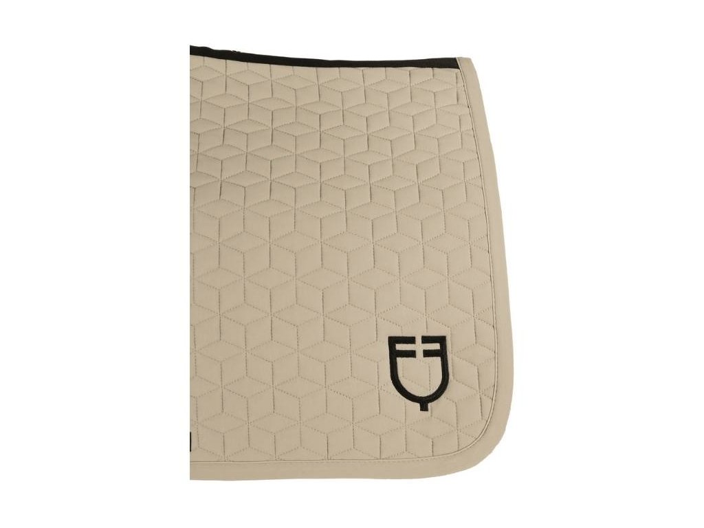 Tato všestranná podsedlová dečka je vyrobena z technického materiálu, který zajišťuje vynikající prodyšnost a nadstandardní absorpci nárazů mezi sedlem a hřbetem koně. Inovativní vaflová vazba uvnitř podporuje optimální ventilaci a reguluje proudění vzduchu, čímž minimalizuje pocení během aktivity. Anatomický tvar dečky je navržen tak, aby se vyhnul nežádoucímu tlaku na kohoutek a umožnil koni volný pohyb bez nepohodlí. Kostkovaný prošev dodává elegantní vzhled a zároveň zpevňuje konstrukci dečky. Výsledkem pečlivého výzkumu je produkt, který spojuje odolnost, prodyšnost a eleganci v dokonalé harmonii. Dekorativní kontrastní vyšívané logo na levé straně podtrhuje precizní zpracování a stylový charakter dečky.