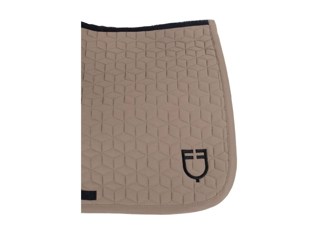 Tato skoková podsedlová dečka je vyrobena z technického materiálu, který zajišťuje vynikající prodyšnost a nadstandardní absorpci nárazů mezi sedlem a hřbetem koně. Inovativní vaflová vazba uvnitř podporuje optimální ventilaci a reguluje proudění vzduchu, čímž minimalizuje pocení během aktivity. Anatomický tvar dečky je navržen tak, aby se vyhnul nežádoucímu tlaku na kohoutek a umožnil koni volný pohyb bez nepohodlí. Kostkovaný prošev dodává elegantní vzhled a zároveň zpevňuje konstrukci dečky. Výsledkem pečlivého výzkumu je produkt, který spojuje odolnost, prodyšnost a eleganci v dokonalé harmonii. Dekorativní kontrastní vyšívané logo na levé straně podtrhuje precizní zpracování a stylový charakter dečky.