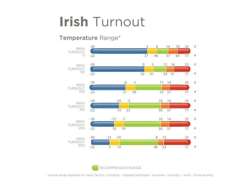 Nepromokavá a prodyšná výběhová deka Irish Turnout od značky Bucas je oblíbená pro svůj výborný poměr cena/výkon a splní veškeré potřeby koně. Teplotní komfort deky je mezi -5° až 10°C. Toto rozmezí je orientační a může být ovlivněno vlhkostí, větrem, slunečním svitem, úpravou srsti koně či jeho aktivitou.