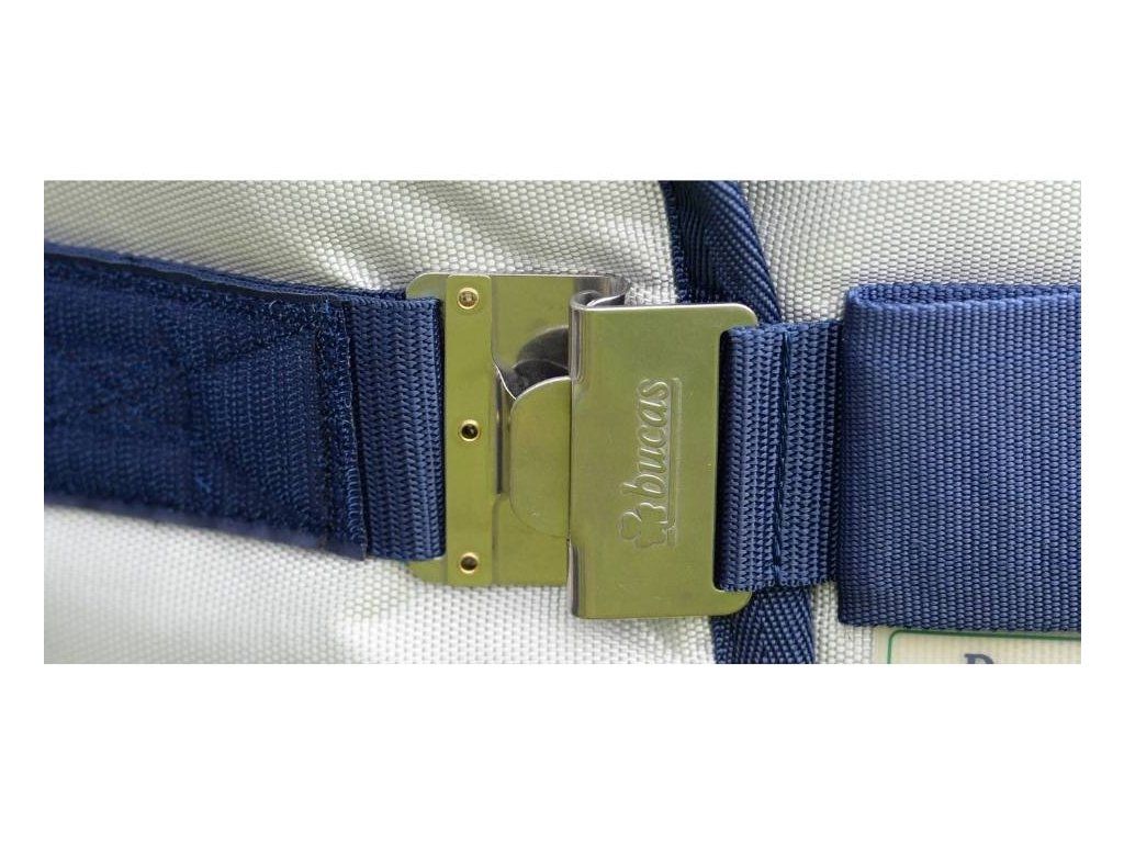 Deka je vybavena křížovým zapínáním pod břichem, předním zapínáním Click’n Go s polstrováním proti oděru, elastickými popruhy kolem zadních nohou.