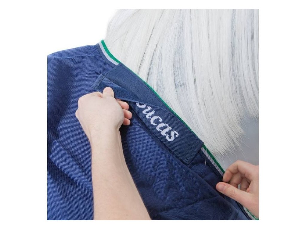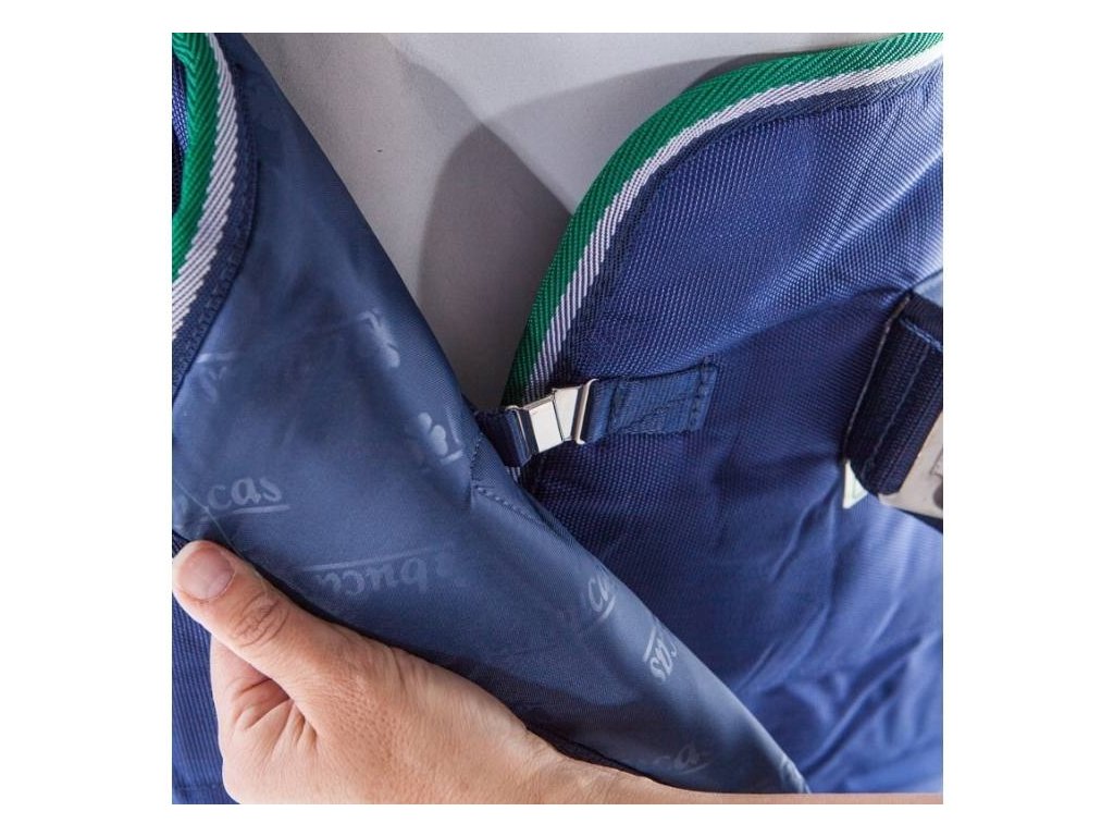 UPOZORNĚNÍ: Voda se může výjimečně dostat dovnitř deky skrze okraje nebo švy, zejména při silném dešti. Obvykle se jedná pouze o velmi omezené množství vody, které může stékat po krku koně a proniknout pod deku. Tento jev je v souladu se záručními podmínkami značky Bucas, je považován za běžný a nepředstavuje výrobní vadu.